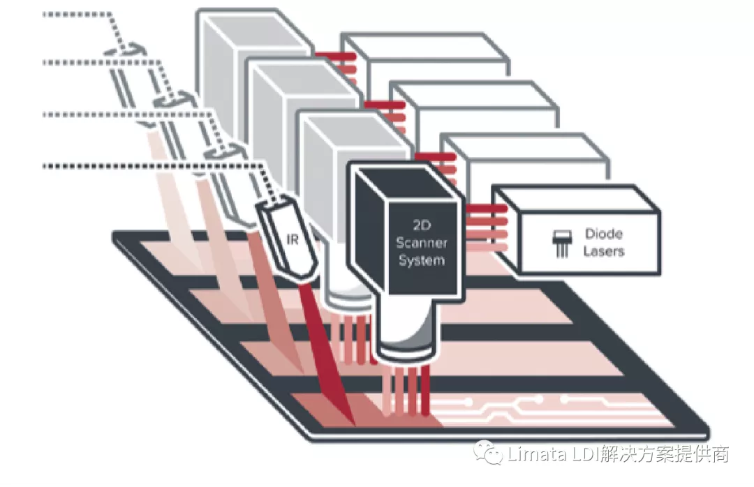 LIMATA's own patent LUVIR. LUVIR high-efficiency solder mask imaging technology includes two types, and at the same time, two laser wavelengths are integrated into a LUVIR imaging unit. This imaging unit contains a customized telecentric optical path and a high-speed (galvanometer-based) 2D scanning system:
